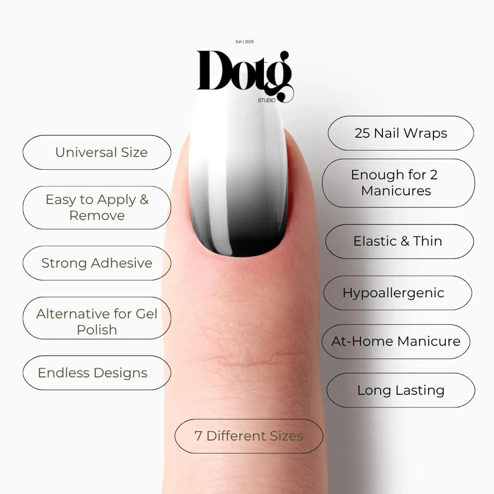 Transform your nails effortlessly with our nail wraps, the perfect alternative to gel polish. They fit every nail with their universal size. Their thin, elastic material ensures a comfortable, natural feel, while the strong adhesive makes application and removal quick and hassle-free. Enjoy long-lasting, stunning nails and endless design possibilities—upgrade your manicure routine today!