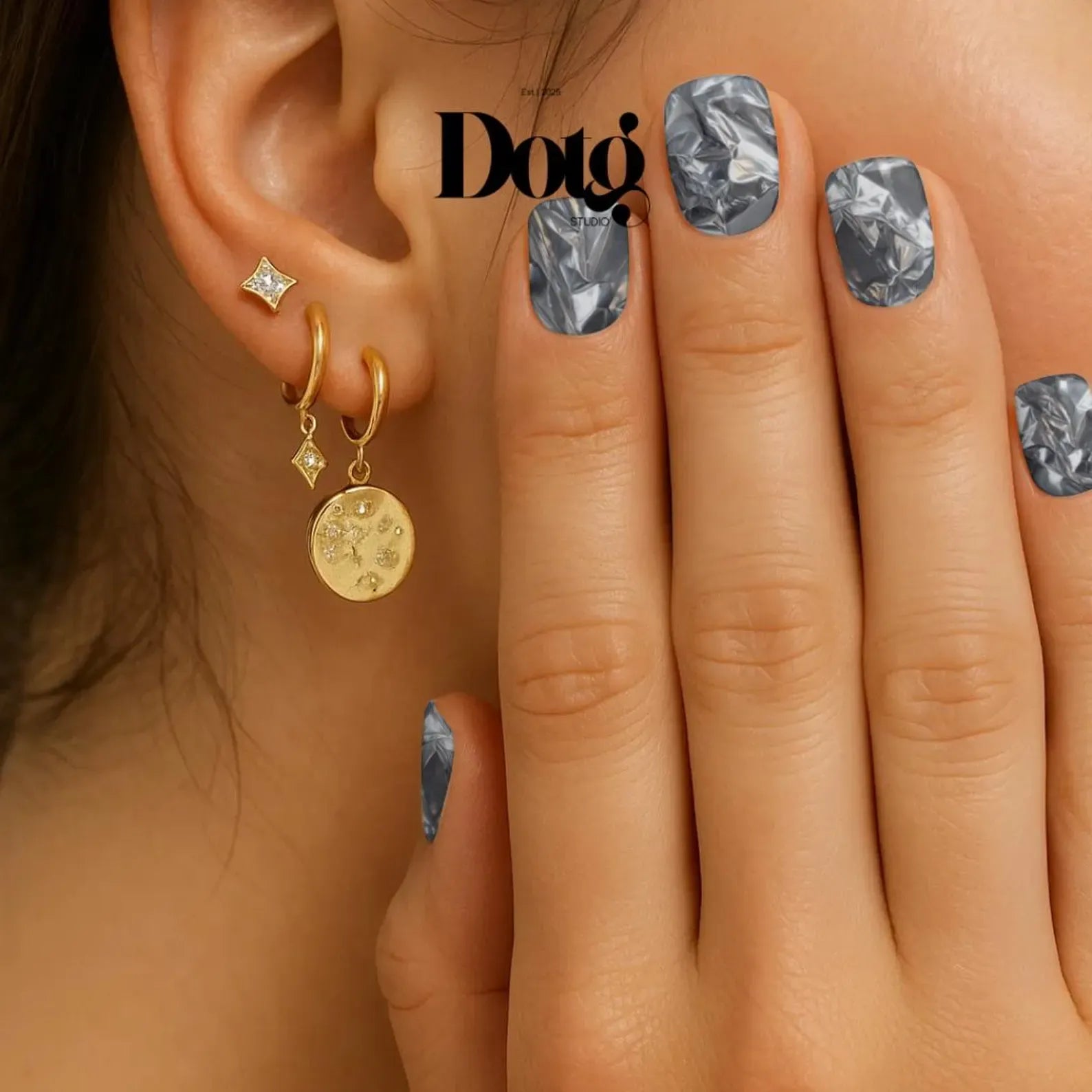 • These Silver Metallic Foil Nail Wraps feature a highly reflective chrome-silver surface with organic crumpled folds and sharp geometric creases, reminiscent of sculpted aluminum or liquid metal.